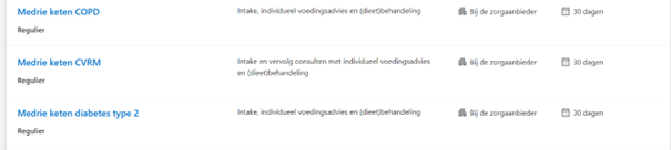 Let op: kies bij ketenzorgpatiënten altijd het juiste product in ZorgDomein om foutieve declaraties en extra werk voor de diëtist te voorkomen. Gebruik één van de volgende producten: